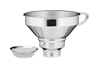Founded in Solingen Germany by Artur Schmitz in 1923, the story of Kuchenprofi is one of dilligence, innovation and refinement. Early on, Kuchenprofi realized the need for affordable functional tools that make the kitchen more efficient and more enjoyable. The name of Kuchenprofi reflects strength, quality and functionality demanded by chefs around the world. Kuchenprofi made for professionals, now available to anyone passionate about cooking. Kuchenprofi's Funnel & Filter makes it easy to strain big batches of stock or sauce, filter oil from deep fryers – even rinse delicate berries. Wide-mouth design and stable base ensure smooth, splash-less operation. Lift-out fine mesh filter traps herbs, burned bits and other unwanted particles. Crafted of 18/10 stainless steel. Dishwasher safe. 3-1/2-inch high, 5-inch diameter.