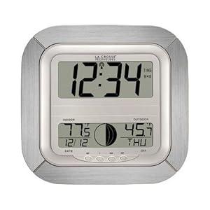 Self-setting digital clock with indoor and outdoor temperature also features alarm with snooze option and low battery indicator for both clock and wireless sensor. Time sets to specified time zone and will automatically reset for daylight saving time. Optional wall hanging or self standing